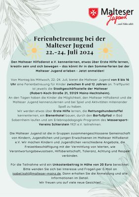Mainz. Am 22. und 23. Mai und von 22. bis 24. Juli 2024 bietet die Malteser Jugend von 8 bis 16 Uhr eine Ferienbetreuung für Kinder zwischen 8 und 12 Jahren an. Treffpunkt ist jeweils die Stadtgeschäftsstelle der Malteser (Robert-Koch-Straße 21, 55129 Mainz-Hechtsheim).