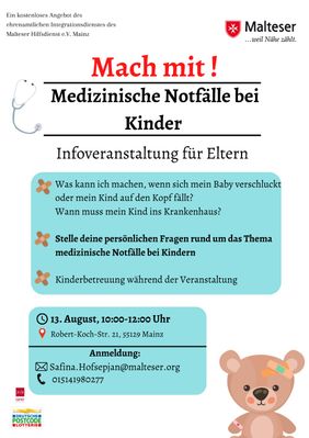 Mainz. Am Samstag, den 13. August 2022 findet ein Elternworkshop unter dem Thema „Medizinische Notfälle bei Kindern“ statt.
